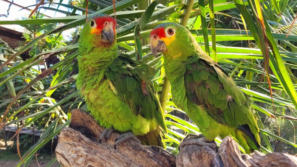 Nach dem Schnorcheln haben wir noch ein wenig Zeit, die kleine Insel zu erkunden. Wir treffen auf ein Papageienpärchen…