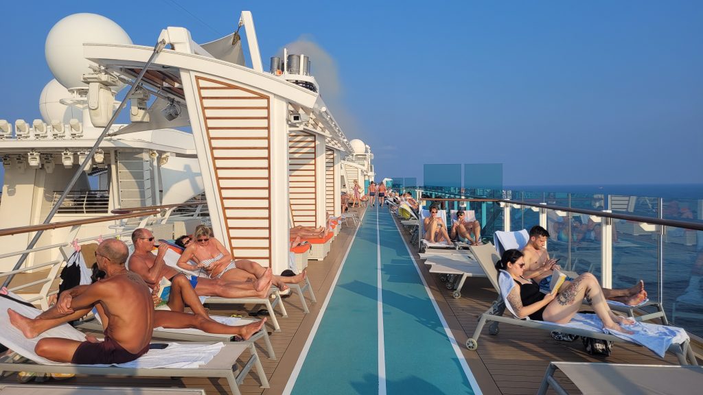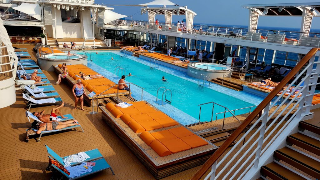 Bei meinem Rundgang über Deck 14 blicke ich auf die Poollandschaft. Es gibt natürlich nicht nur diesen einen Pool, aber ich denke, ein Foto reicht.