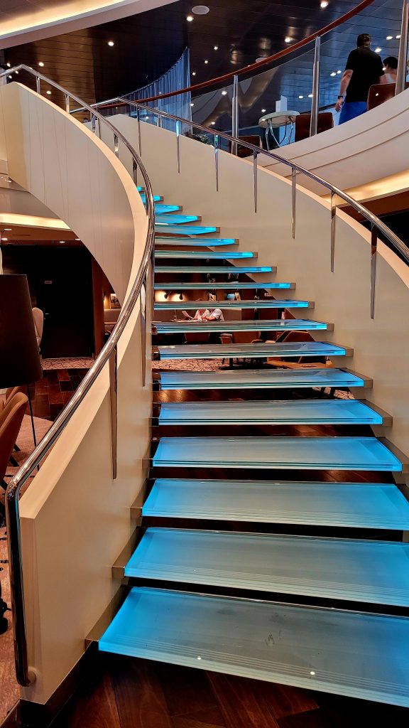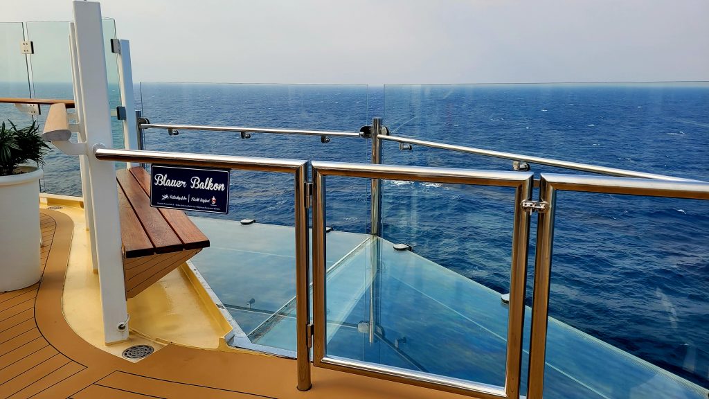 Neben der Bar auf Deck 14 befindet sich der Blaue Balkon. Ein kleiner Balkon mit Glasboden, von dem aus man das Meer unter sich sehen kann. Eine tolle Sache, wie wir finden.