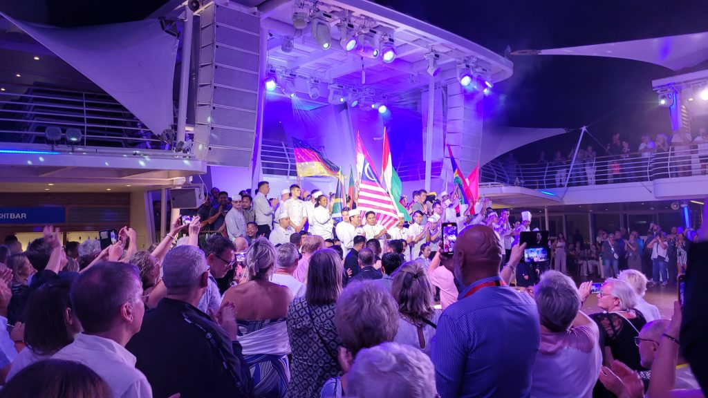Am Abend findet die große Abschiedsparty auf dem Pooldeck statt. Besonderes Highlight: Vertreter der aus 929 Mitgliedern bestehenden Crew aus über 40 Nationen ziehen Fahnen schwenkend an den Gästen vorbei auf die Bühne, um sich bei ihnen zu bedanken. Umgekehrt bedanken sich die Gäste klatschend und jubelnd bei der Belegschaft für deren Einsatz. Ein Gänsehautmoment.