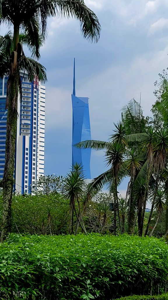 Auf unserer Fahrt durch Kuala Lumpur ist ein Gebäude ständig präsent. Und zwar dieses. Wir erfahren, es ist der Merdeka-Tower – oder auch Independance Tower genannt – und mit 678,9 m aktuell das zweithöchste Gebäude der Welt. Warum es so aussieht und was es damit auf sich hat, erfahren wir später.
