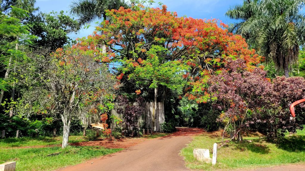 Jetzt komme ich tatsächlich noch dazu, eine Aufnahme von diesem herrlichen rotblättrigen Baum zu machen. Es ist ein Flammenbaum und gehört zu den Akaziengewächsen. Ich hatte ihn schon mehrfach aus dem Auto heraus gesehen und bewundert. In Argentinien verlieren im Winter aufgrund des milden Klimas nur 10 Prozent aller Bäume und Sträucher ihre Blätter. Der Flammenbaum gehört dazu. Sobald er beginnt, seine Blätter abzuwerfen, sollte man auf keinen Fall sein Auto über Nacht darunter parken, sonst ist es am nächsten Morgen von einer dicken klebrigen roten Schicht überzogen.