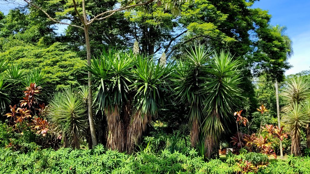 Das Resort ist fußläufig zu erreichen und so machen wir uns auf den Weg. Schöne Pflanzen säumen den Weg. Alles grünt und blüht hier so üppig. Da es aber bereits am Vormittag über 30 Grad heiß ist, fällt uns das Laufen schwer.