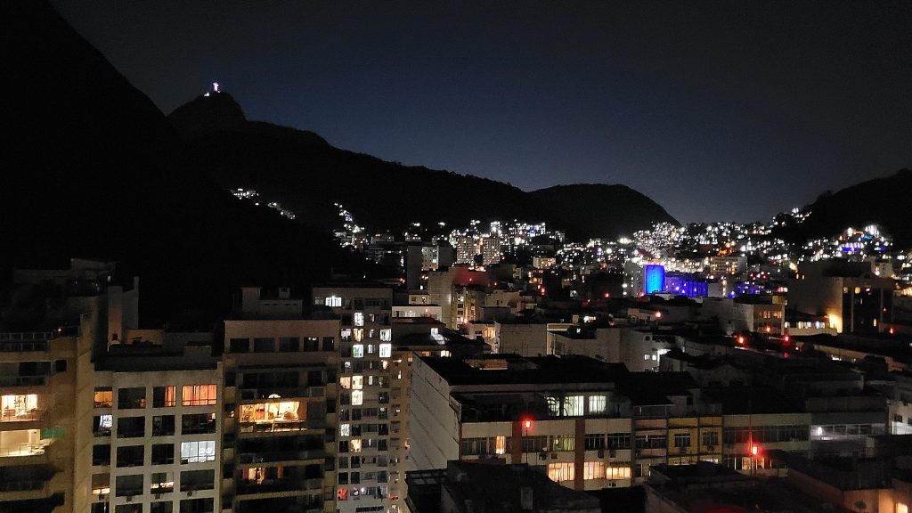 Im Hotel angekommen, fahren wir sofort hoch auf die Dachterrasse und genießen zum Abschluss des Tages einen tollen Blick über nächtliche Rio und auf die Christus-Statue.