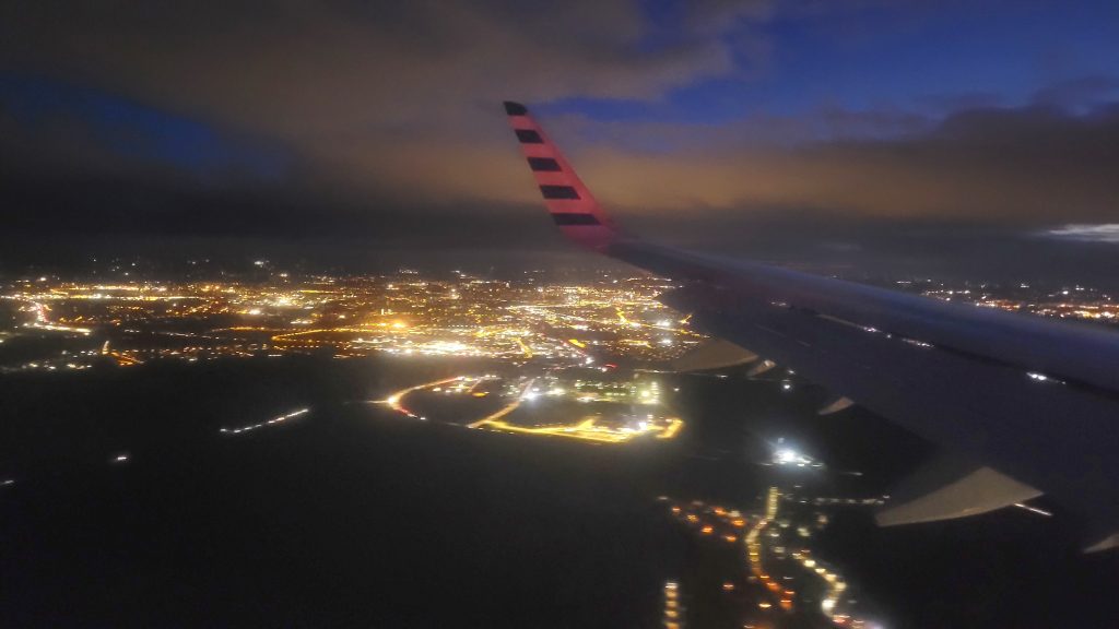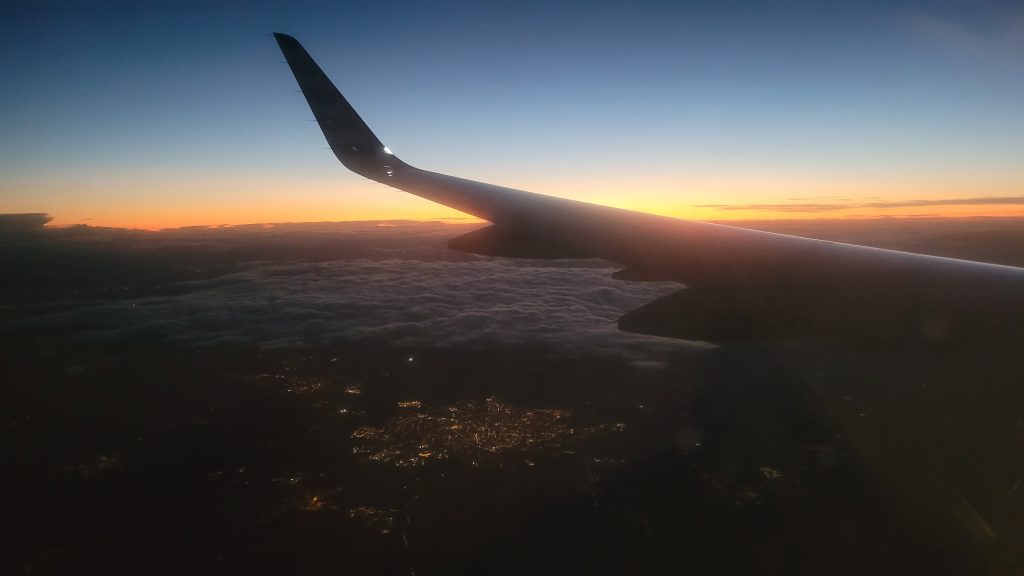 Als wir uns nach einem angenehmen Flug der Heimat nähern, neigt sich der Tag bereits wieder dem Ende.