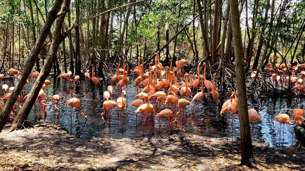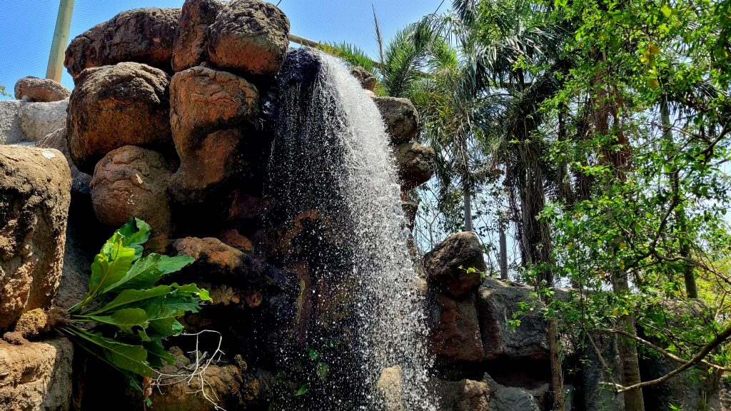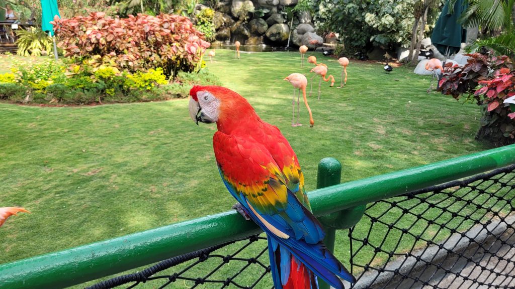 Das haben wir so noch nirgends erlebt und es ist zum Abschluss des Tages ein versöhnliches Erlebnis. Diese schönen rosa Flamingos und überall die bunten Papageien und Pfauen inmitten herrlicher Grünanlagen, aber in Freiheit und ohne Netze über sich.