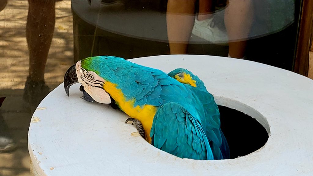 Wir haben tatsächlich viele schöne bunte Papageien gesehen und erlebt, wie intelligent sie sind, aber den hier fanden wir besonders lustig. Gefunden hat er aber offenbar nichts Interessantes in dem Mülleimer.