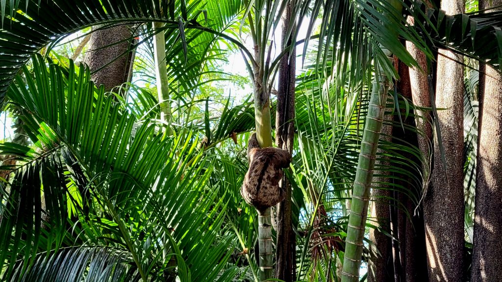 Die Krönung aber ist dieses Faultierjunge, das eben von seinem Baum herunterklettert. Normalerweise bleiben Faultiere immer oben in der Baumkrone. Nur einmal aller 8-10 Tage kommen sie herab auf den Boden, um ihr Geschäft zu verrichten. Haben wir ein Glück – genau so einen Tag erwischen wir heute und können das Tier aus allernächster Nähe betrachten.
