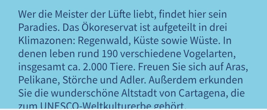 Über die irreführende Ausflugsbeschreibung haben wir uns natürlich bei der MeinSchiff-Reiseleitung beschwert. Wenn von vornherein klar definiert gewesen wäre, was sich hinter dem Begriff „Öko-Naturreservat“ verbirgt, hätten wir diesen Ausflug auf keinen Fall gebucht.