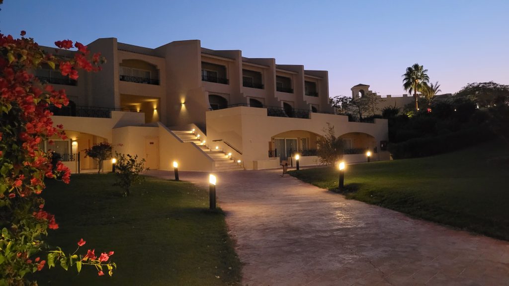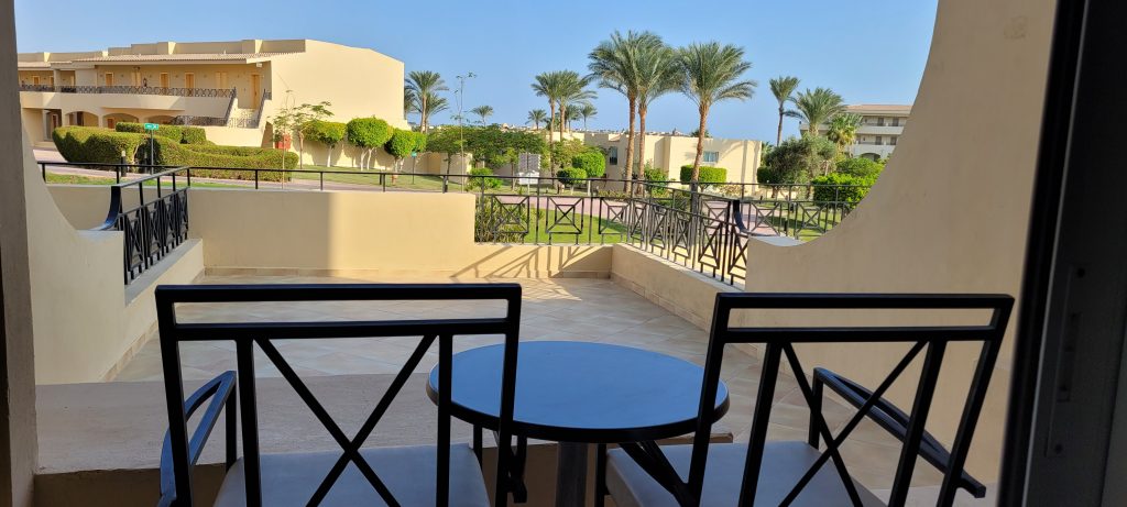 Blick aus unserem Hotelzimmer. Es sind alles zweigeschossige Gebäude, herrlich gelegen