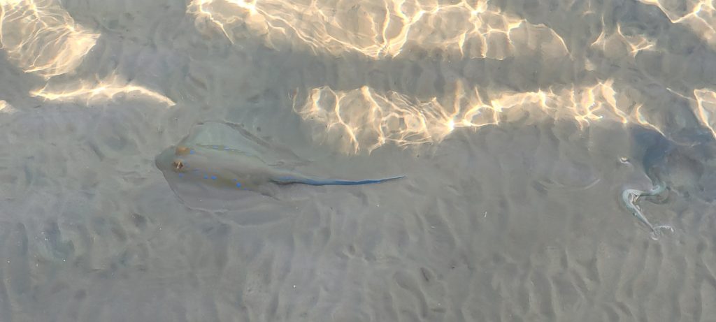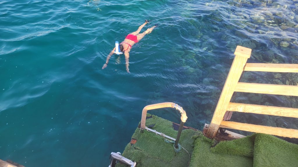 Strandspaziergang. Wir laufen zu dem Steg, der 200m ins Meer hinein führt und und von dem aus man am hauseigenen Riff herrlich schnorcheln kann. Es ist noch sehr intakt und man fühlt sich wie in einer anderen Welt.