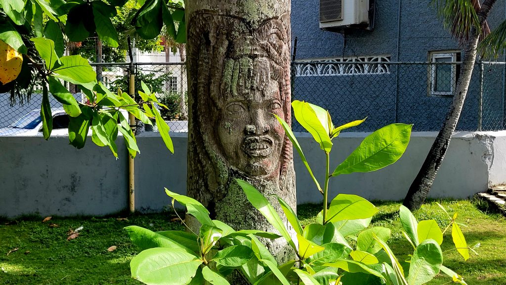Und auch das entdecken wir auf unserem Weg: ein Gesicht, in einen Baum geschnitzt.