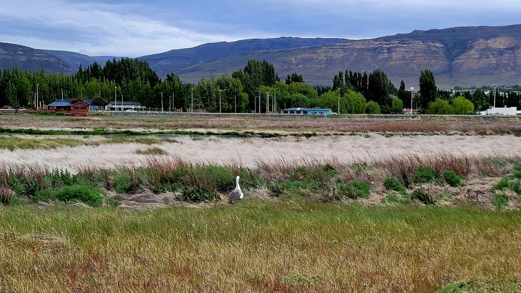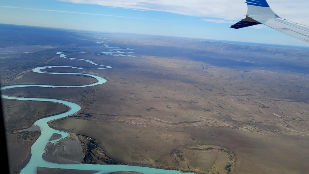 Von oben erkennen wir bereits den riesigen Fluss Rio Santa Cruz. Er ist nicht zu übersehen. Ihm kommt eine wichtige Bedeutung zu. Er entwässert den Gletschersee Lago de Argentino und mündet anschließend in den Atlantik.