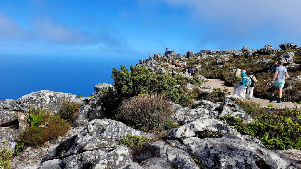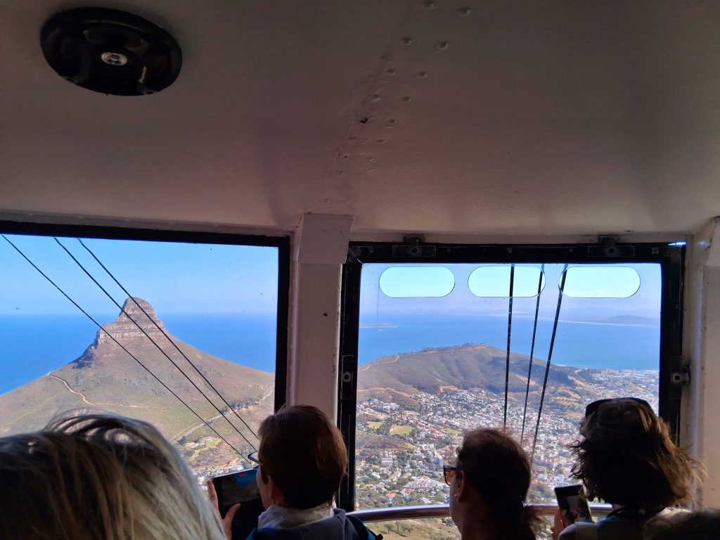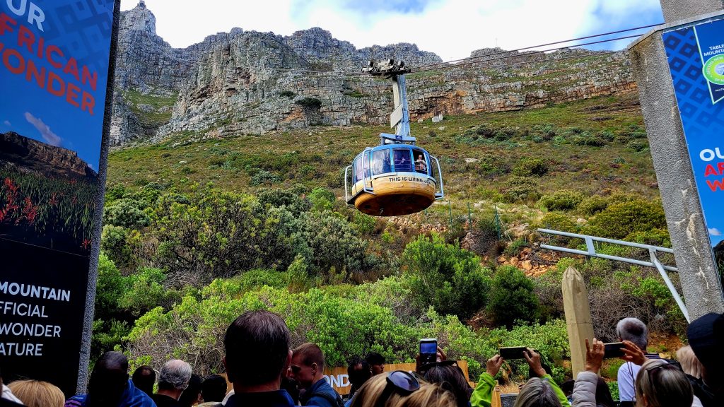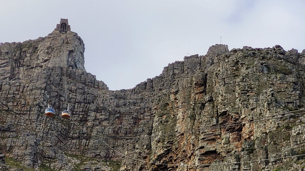 Heute steht nun endlich das Highlight an, auf das wir so sehnsüchtig gewartet und gehofft haben: das Wetter spielt mit und wir machen uns auf den Weg zum Tafelberg. Dort angekommen haben wir Glück, denn so früh am Morgen stehen an der Seilbahn um diese Zeit kaum Leute und wir müssen nicht lange warten.
