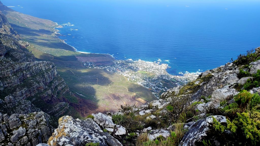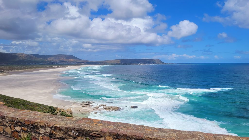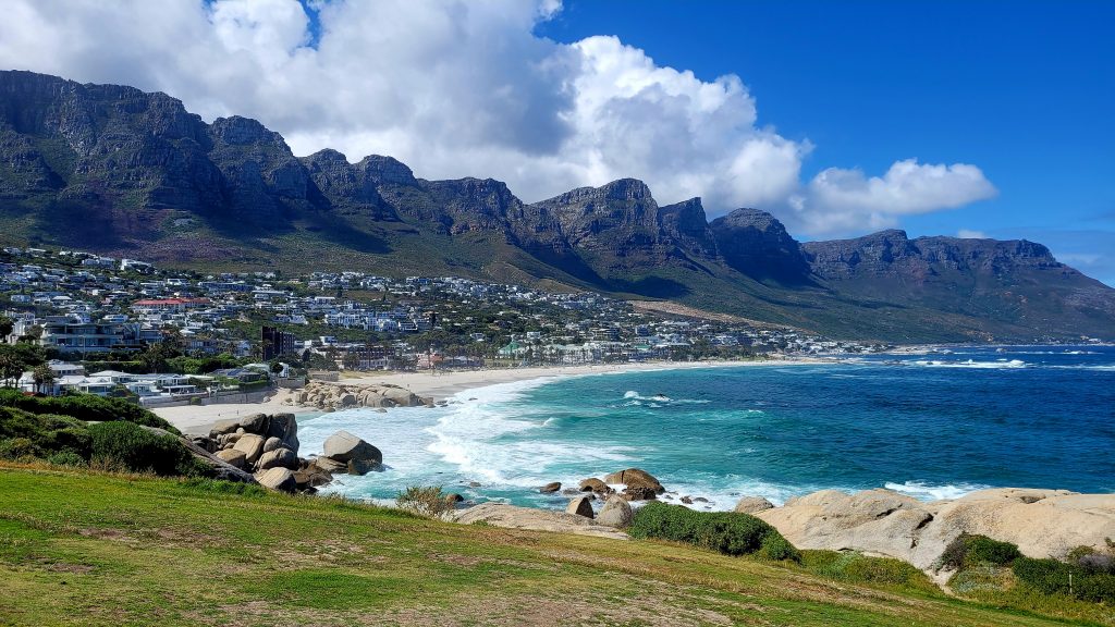 Bevor wir uns auf den eigentlichen Weg des heutigen Tages – die Garden Route – machen, stoppen wir noch einmal an der Camps Bay, wo wir gestern schon kurz waren und wo sich heute aufgrund der tollen Wetterlage der Blick auf die Spitze des Tafelbergs und die 12 Apostel für uns öffnet.