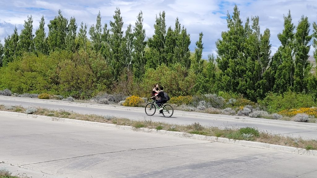Im Moment sind nicht viele Menschen hier unterwegs. Aber immerhin kommt ein Fahrrad vorbei. Wir amüsieren uns über die Nutzungsweise.