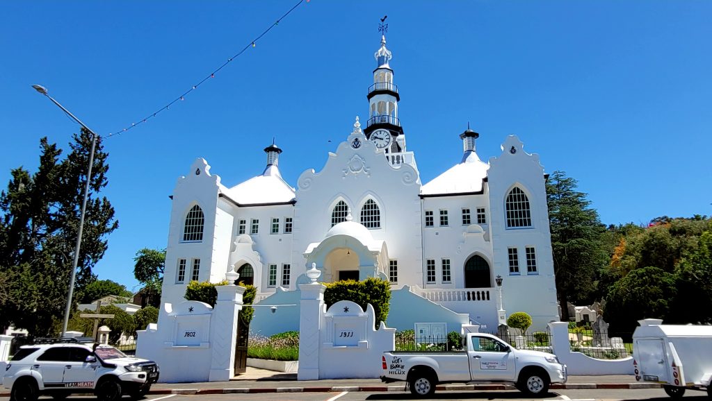 In Swellendam angekommen, halten wir als erstes an dieser herrlichen, weißen Kirche. Sie wurde 1802 von muslimen Sklaven gebaut, was großen Einfluss auf das Design hatte.