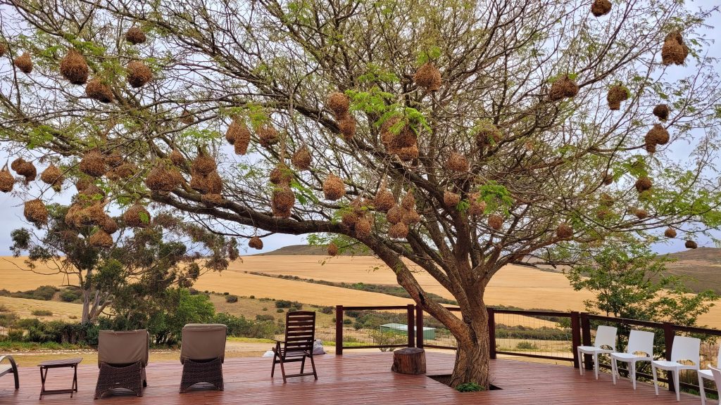 Direkt auf der Poolterrasse steht ein Baum mit vielen Webervogelnestern. Da die Vögel aber noch nicht aus dem Winterquartier zurück sind, kann die Terrasse ganz entspannt genutzt werden.